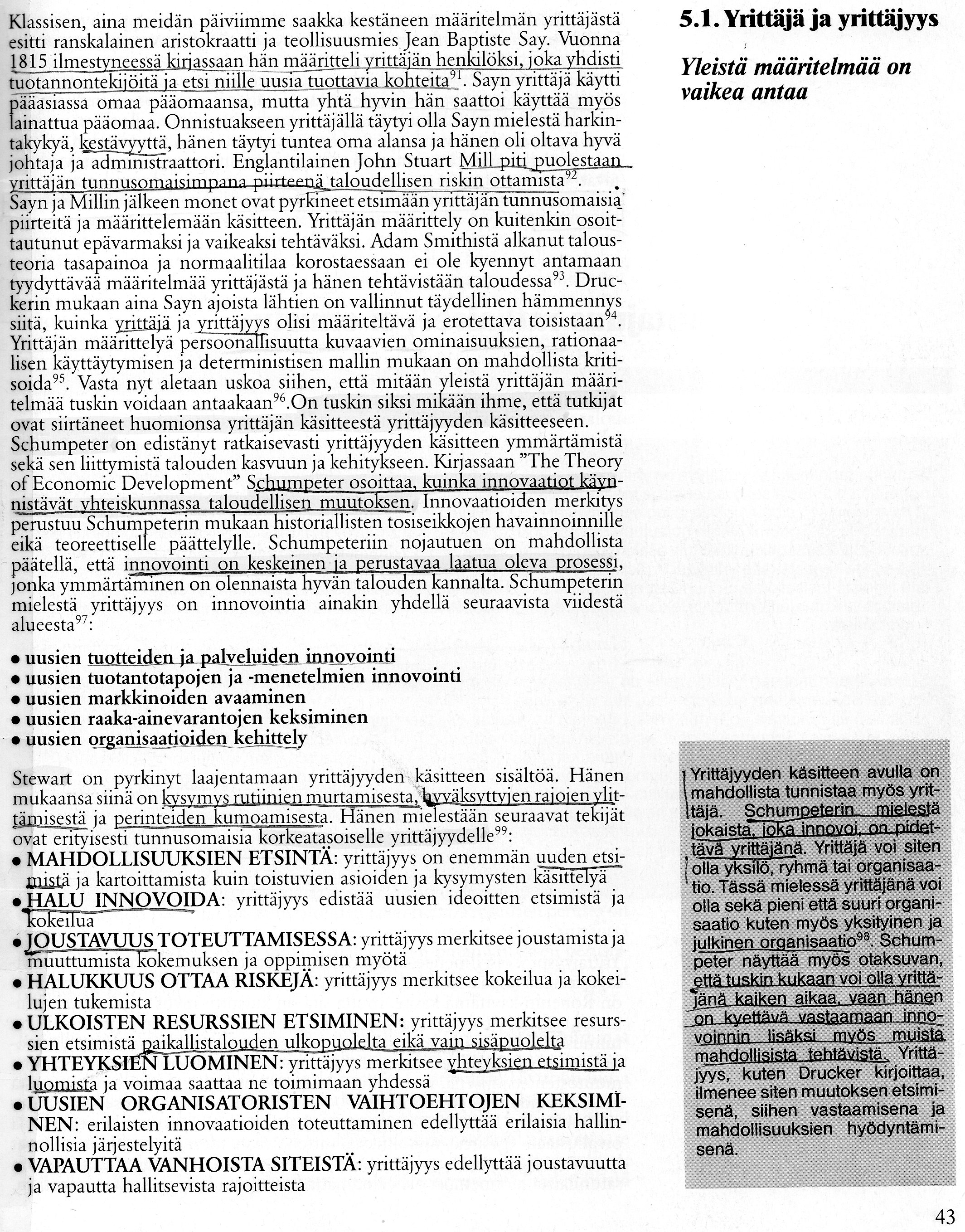 ”Schumpeterin mielestä yrittäjyys on innovointia ainakin yhdellä seuraavista viidestä alueesta(97):