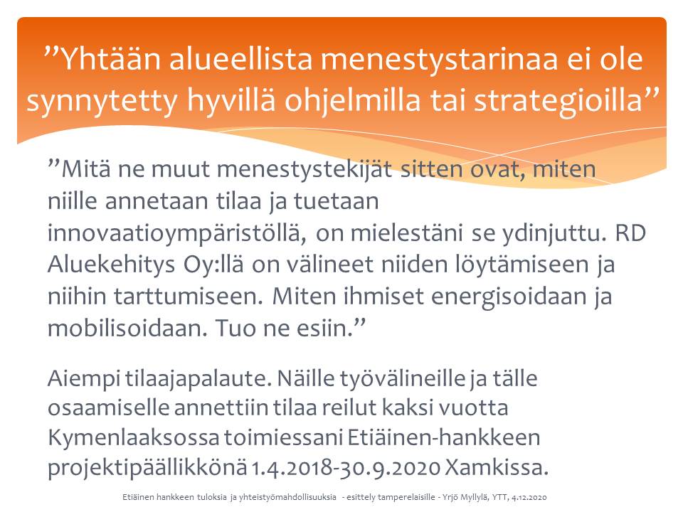 Aiempi tilaajapalaute. Näille työvälineille ja tälle osaamiselle annettiin tilaa reilut kaksi vuotta Kymenlaaksossa toimiessani Etiäinen-hankkeen projektipäällikkönä 1.4.2018-30.9.2020 Xamkissa.