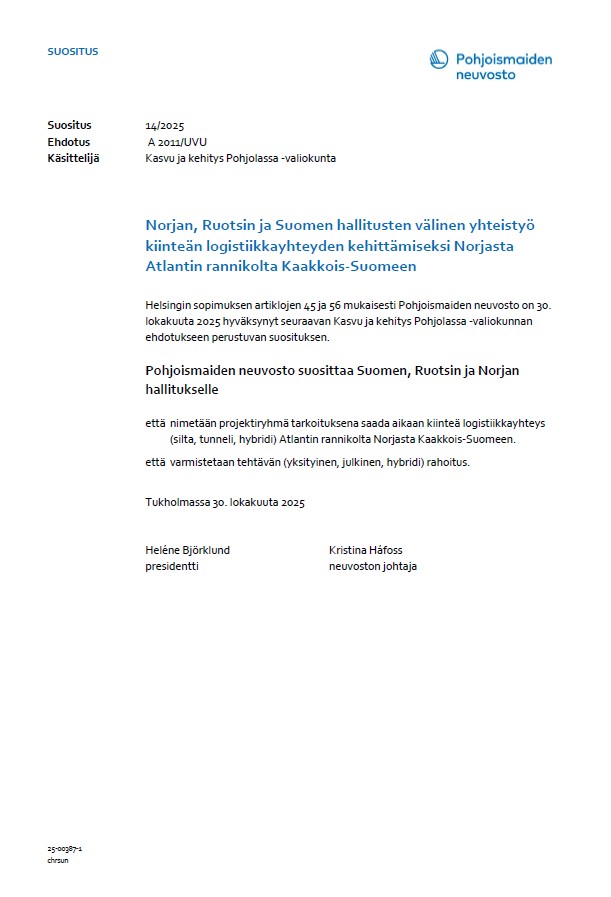 Pohjoismaiden neuvoston yksimielinen suositus kiinteän logistiikkayhteyden rakentamiseksi Norjasta Atlantin rannikolta Kaakkois-Suomeen