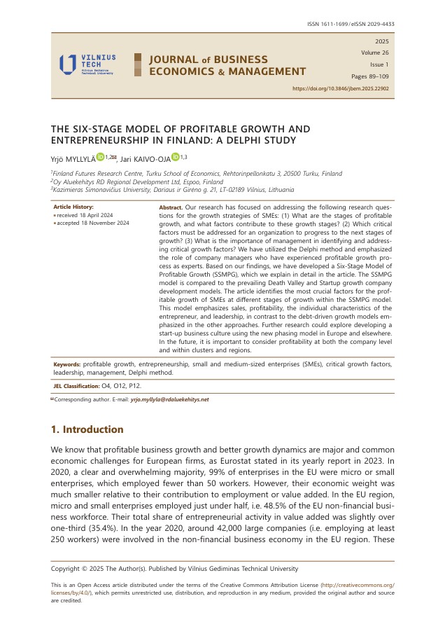 Myllylä, Y., & Kaivo-oja, J. (2025). The six-stage model of profitable growth and entrepreneurship in Finland: a Delphi study. Journal of Business Economics and Management, 26(1), 89–109. https://doi.org/10.3846/jbem.2025.22902 .