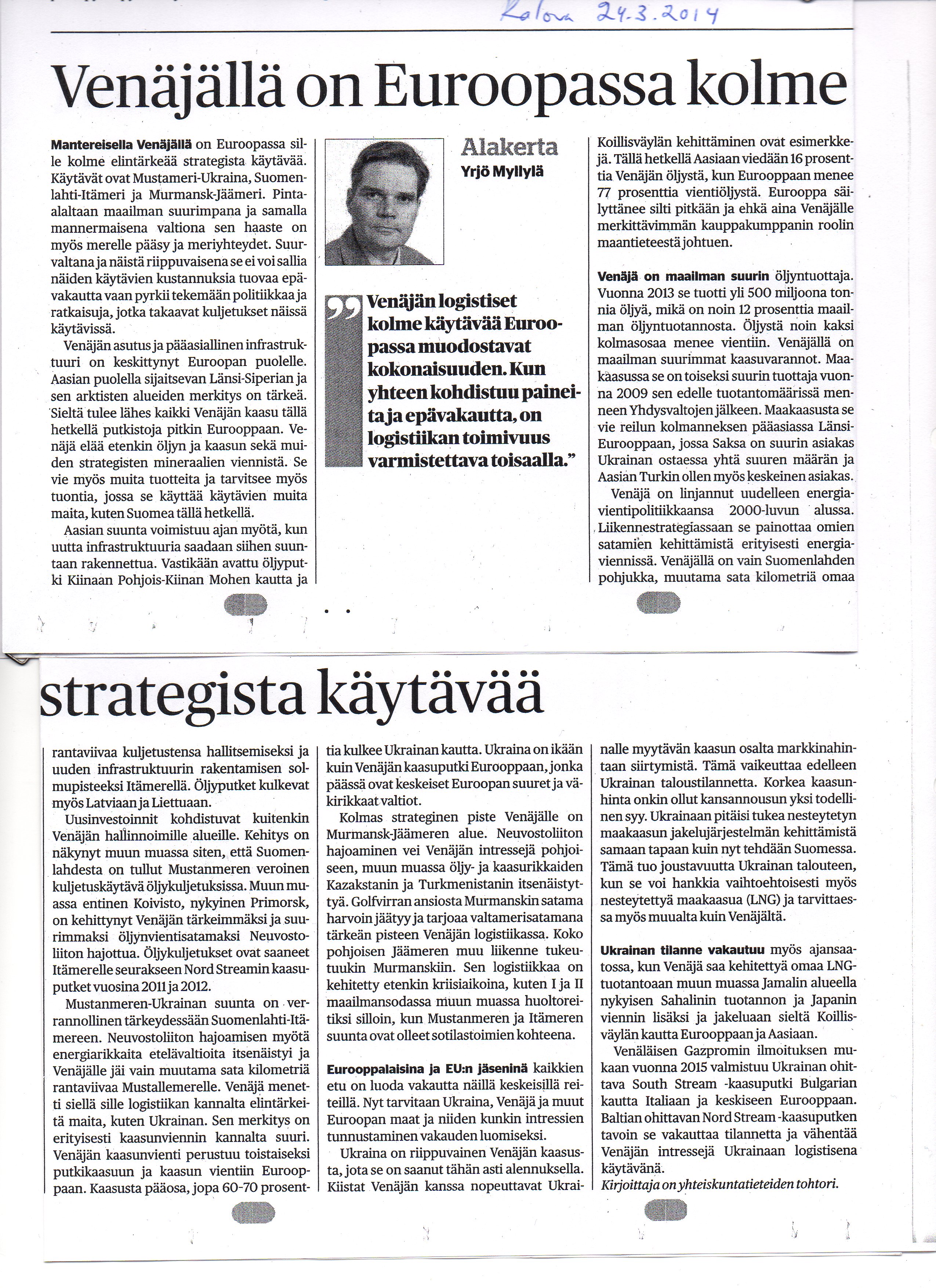 - Kainuun Sanomat, Tiistaivieras 11.3.2014: ”Venäjällä on Euroopassa kolme strategista käytävää”