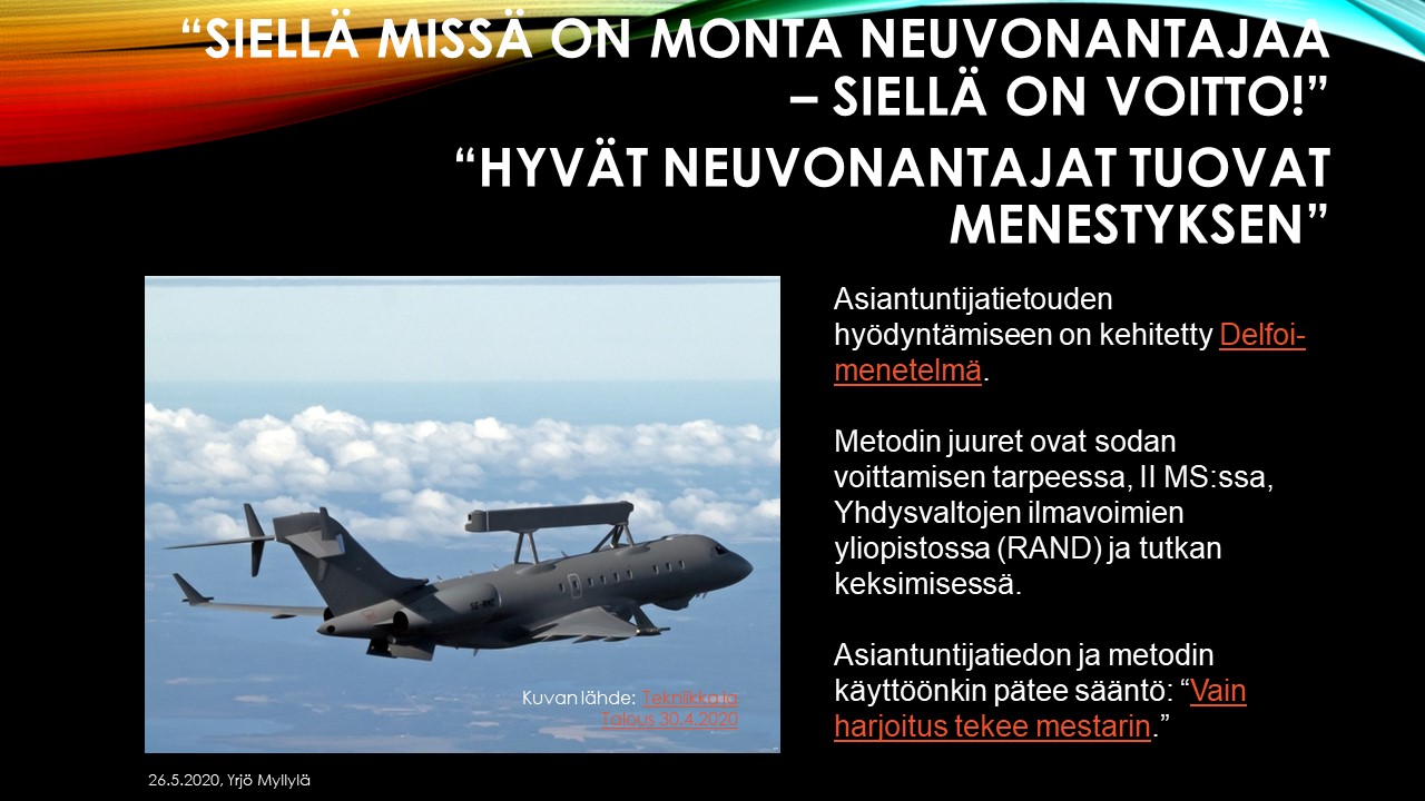Emme voi syrjäyttää tuhatvuotista viisautta. ”Siellä missä on viisaat neuvonantajat, siellä on voitto.” Tarvitsemme erilaisia näkökulmia, erilaisia asiantuntijoita kulloisenkin ilmiön ja kehittämiskohteen tarkasteluun, sen tulevaisuutta arvioimaan ja tekemään. Kyse on asiantuntijatiedon hyödyntämisestä. https://rdaluekehitys.net/rd-konsepti/rd-ratkaisu-delfoi-sovellukset/
