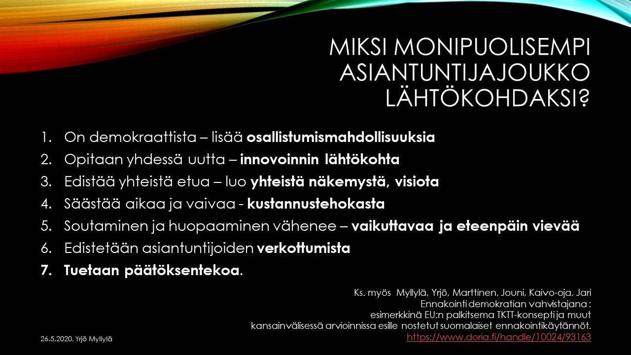 ASIANTUNTIJOIDEN VALINTA. Asiantuntijatiedon käyttöön erikoistunut YTT Yrjö Myllylä esittelee kuinka asiantuntijat tulee valita. Ajattelutapaa voidaan soveltaa hyvin monenlaisten neuvonantajaryhmien kuten jopa hallitusten ja työntekijöiden valintaan. Yrjö Myllylän osaaminen perustuu Delfoi-paneelien valinnan lähtökohtiin ja vuosikymmenten kokemukseen hyvän Delfoi- paneelin ja siten onnistuneen neuvonantajaryhmän valitsemiseksi. Hän on myös itse soveltanut ajattelutapaa muuhunkin kuin Delfoi-menetelmään, kuten vaikuttavien tapahtumien suunnitteluun, esimerkkinä Valkoisen Meren messut ja Barentsin käytävän kehittämisseminaari. https://rdaluekehitys.net/henkilokuva/