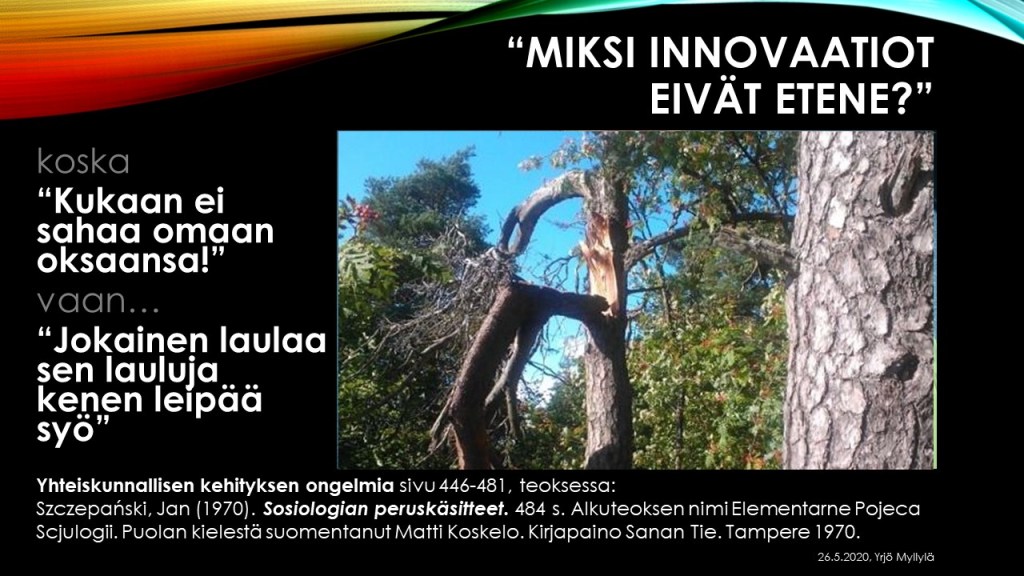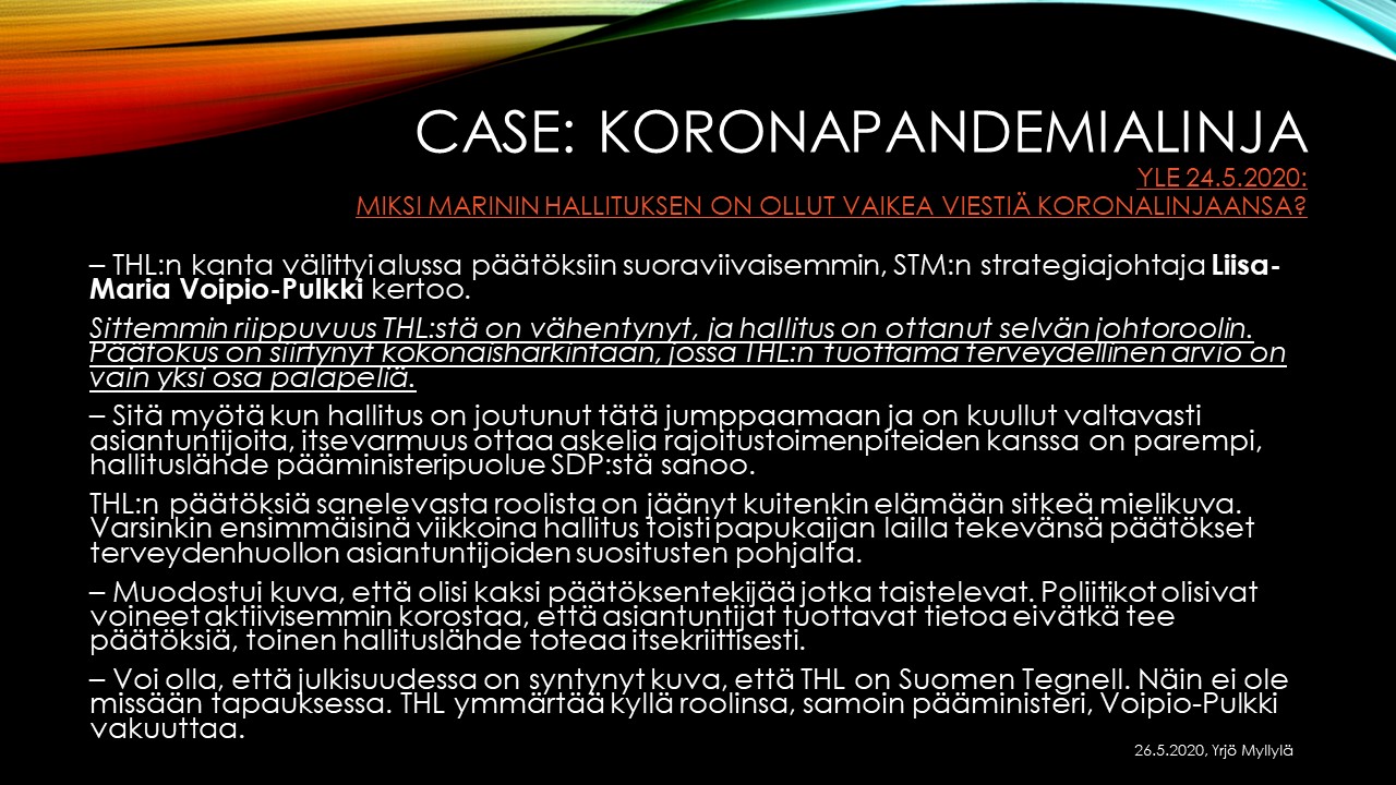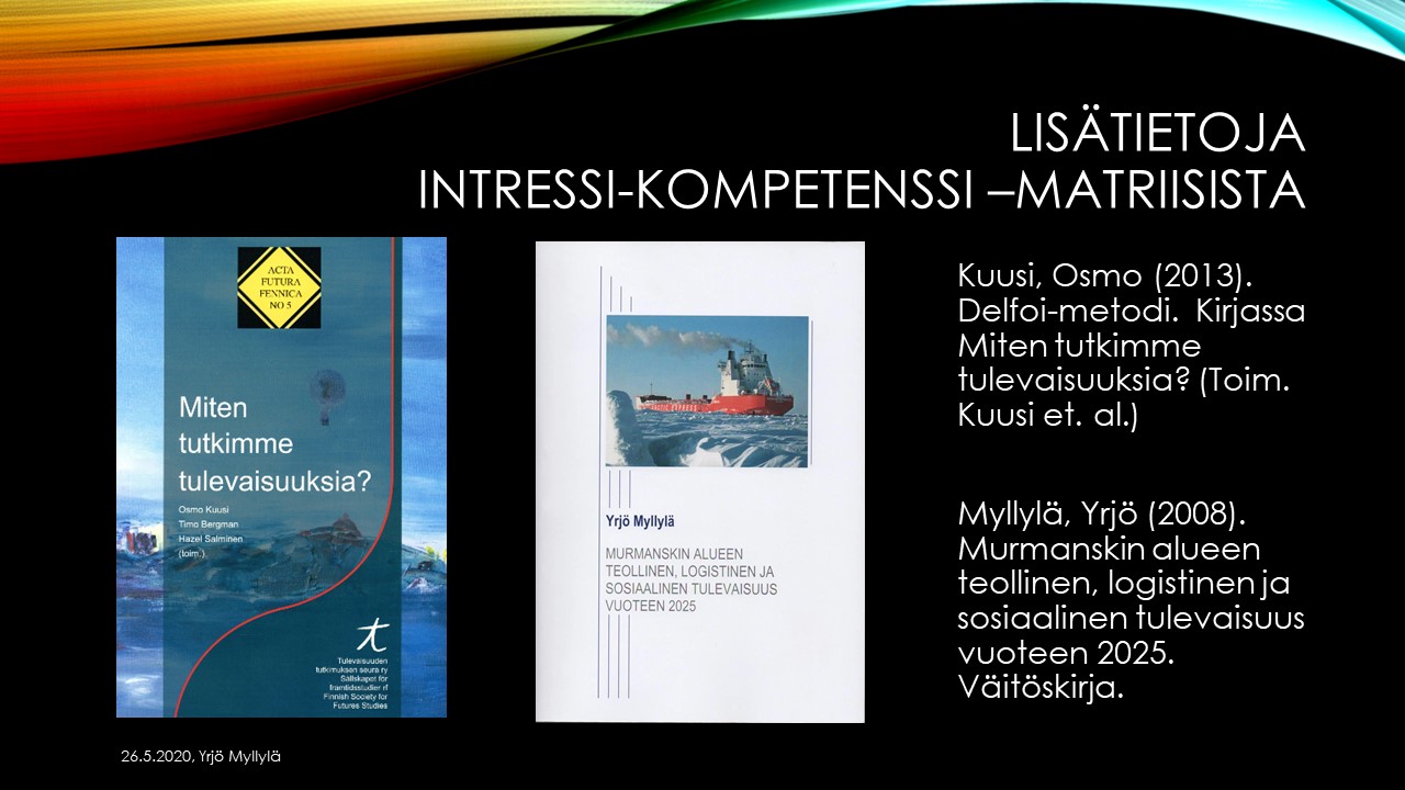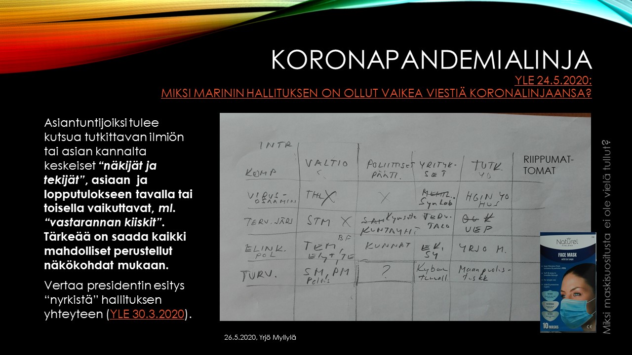 Yrjö Myllylä piti esitelmän 26.5.2020 TKI-toimijoille otsakkeella ”Matriisiajattelu kompleksisessa ennakoinnissa”. Esimerkkinä siinä oli mm. suhtautuminen pandemianhallintaan. Alla on muutam kalvo esitelmästä. Myllylä on ollut myös keskeisessä roolissa IKNOW Delfoi-tutkimushankkeessa, jossa tutkittiin villejä kortteja, joihin EU:n tulisi varautua. Kymmenen vuotta sitten valmistuneen EU:n komission tilaaman tutkimuksen mukaan tärkeintä olisi varautua pandemiaan (ks. lisätietoja).
