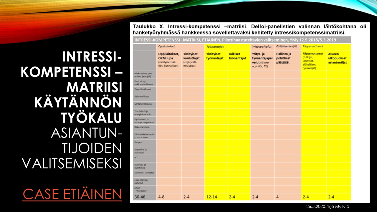Hyvänä esimerkkinä intresssi-kompetenssi -matriisin soveltamisesta Myllylä puolestaan nostaa Etiäinen – Kymenlaakson koulutus- ja osaamistarpeiden ennakointiprojektin asiantuntijoiden valinnan niin pitkän aikavälin ennakoinnin Delfoi-paneelissa, Osaava Kymenlaakso 2030 -tulevaisuusverstaissa kuin lyhyen aikavälin toimialakohtaisessa ennakoinnissa. Näissä kaikissa painotettiin kahden intrressiryhmän edustusta ja tulosten analyysiä intressiryhmissä. Pääryhmät olivat työnantajat ja oppilaitosten edustajat, jotka ovat ilmiön kannalta keskeisiä unohtamatta muita sidosryhmiä. Etiäinen hankkeen tulokset olivat jo hankkeen aikana merkittävät: https://yrjomyllyla.wordpress.com/2020/12/03/etiainen-kymenlaakson-koulutus-ja-osaamistarpeiden-ennakointihankkeen-top-10-vaikutusta/ .